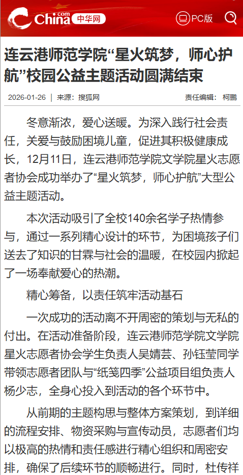 【中华网】连云港师范学院“星火筑梦,师心护航”校园公益主题活动圆满结束