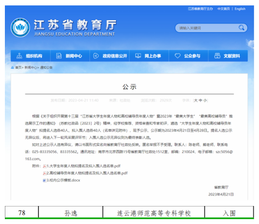 近日,第十三届江苏省“大学生年度人物”暨2023年“最美大学生”提名人选风采展评活动在南京农业大学举行。我校海洋港口学院孙逸同学荣获第十三届“江苏省大学生年度人物”入围奖。