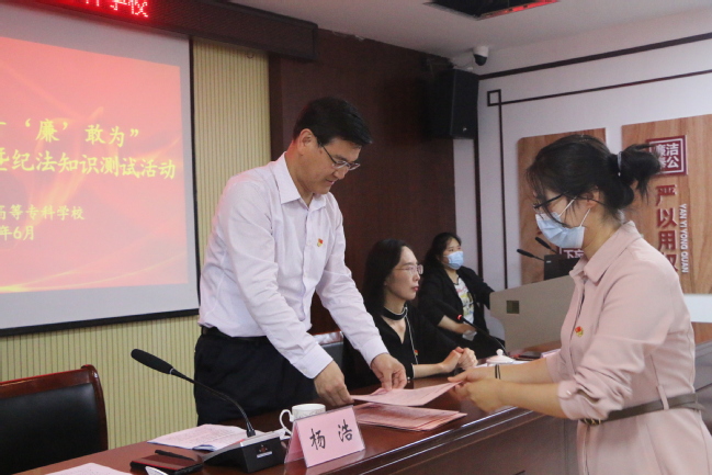 开展廉洁承诺暨纪法知识测试。学校向年轻干部发放了《年轻干部廉洁教育案例读本》和《年轻干部家属助廉倡议书》,年轻干部向学校党委递交了廉洁承诺书,进行了廉洁从政宣誓并参加了纪法知识测试。校党委书记杨浩带领与会年轻干部重温了习近平总书记2022年3月在中央党校中青年干部培训班开班式上的重要讲话精神,并从“廉”和“为”两个方面对学校年轻干部提出了要求。他指出“廉”要做到“明身份、知规矩、守底线”。“为”就要想干事、敢干事、会干事、干成事、不出事。