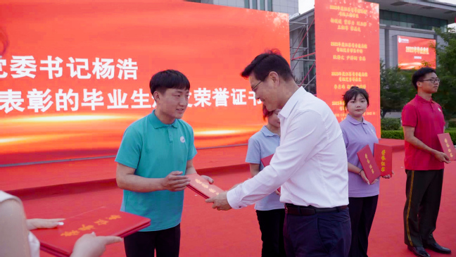 刘长虹宣读了《关于表彰2023届优秀毕业生的决定》,丁红星、房玥婷为校级优秀毕业生颁发荣誉证书,王布新、李传江为毕业生代表赠送毕业纪念品,全体校领导为毕业生代表颁发毕业证书。