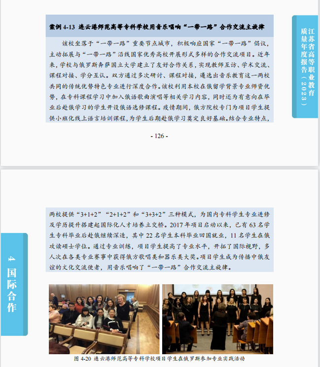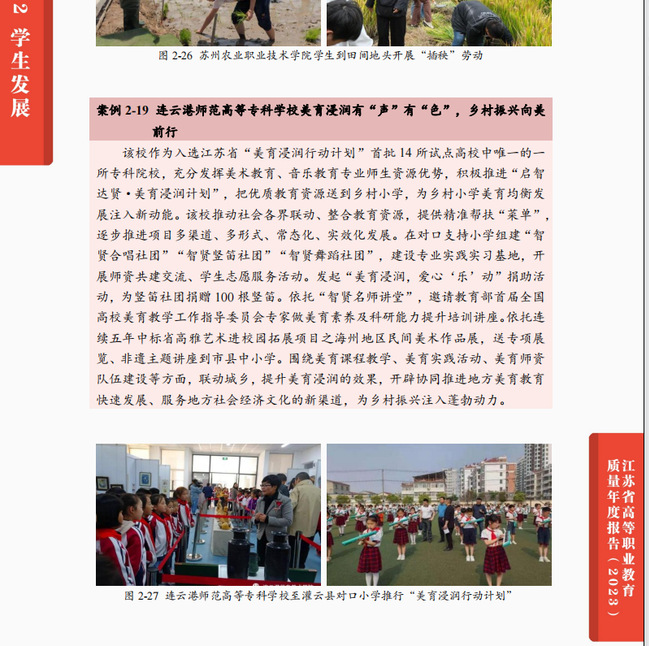 江苏省质量年报是高等职业教育履行责任担当、确立质量发展观、宣传发展成绩、接受社会监督的重要制度载体。此次全省90所高等职业院校共报送了1136项典型案例,省年报选用157项。我校学前教育学院(音乐学院)和美术学院的“美育浸润有“声”有“色”,乡村振兴向美前行”以及外语与商务学院(国际教育学院)的“用音乐唱响“一带一路”合作交流主旋律”两个案例成功入选。