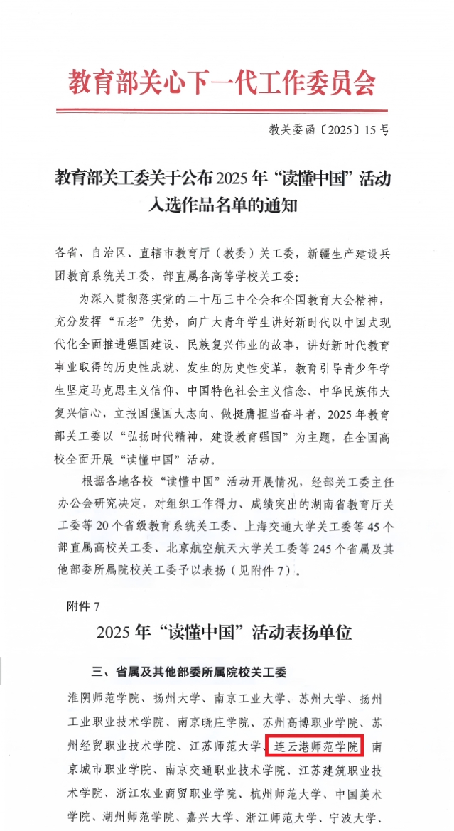 近日,我校关工委获评教育部关工委2025年“读懂中国”活动表扬单位。