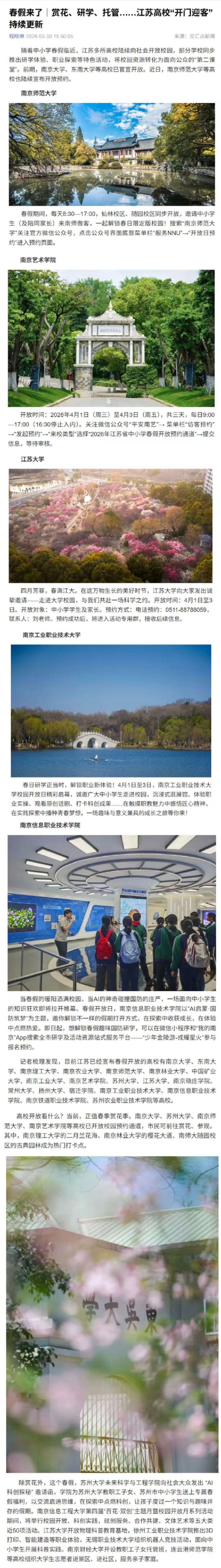 【新华日报•交汇点】春假来了|赏花、研学、托管……江苏高校“开门迎客”持续更新
