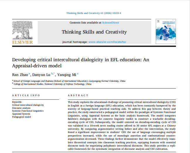 近日,我校外语与商务学院(国际教育学院)赵冉博士以第一作者身份,在国际期刊《Thinking Skills and Creativity》(SSCI来源期刊,JCR1区,中科院2区,影响因子4.5)发表题为“Developing critical intercultural dialogicity in EFL education: An Appraisal-driven model”的研究论文。